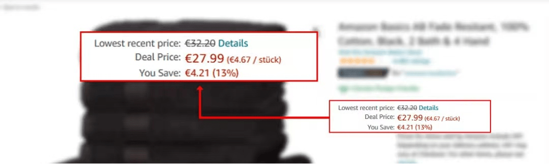 因此,亞馬遜歐洲站(除英國(guó)站外)的商品已經(jīng)(或?qū)?huì))顯示過(guò)去30天該商品在亞馬遜商城的最低價(jià),標(biāo)記為“近期最低價(jià)(Lowest recent price)” ,如下圖所示。鮮明的價(jià)格對(duì)比會(huì)增加視覺(jué)沖擊力,也能讓您的商品更具競(jìng)爭(zhēng)力和吸引力。