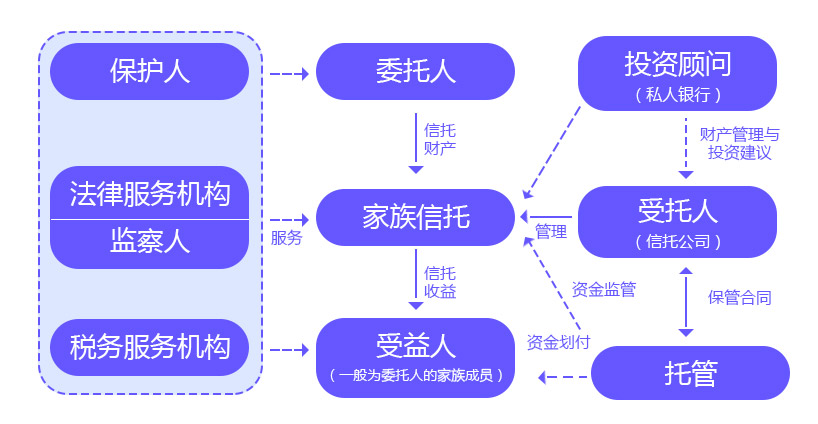 家族信托是以個人作為委托人,以家庭財富的管理、傳承、保護為目的的信托,通過資產(chǎn)管理、投資組合等理財服務(wù)實現(xiàn)對家族資產(chǎn)負(fù)債的全面管理,提供財富轉(zhuǎn)移、遺產(chǎn)規(guī)劃、稅務(wù)策劃、婚姻財富管理、子女教育、家族治理、慈善事業(yè)等全方位的服務(wù),受益人一般為本家族成員。