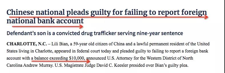 2019年7月8日,住在北卡夏洛特市的59歲中國公民Lili,出現在聯邦法庭認罪。她持有美國綠卡,承認在中國境內某金融機構,有超過1萬美元的賬戶,且未向財政部上報外國銀行和金融帳戶表格(Foreign Bank and Financial Account Form,FBAR),繼而遭到聯邦起訴。