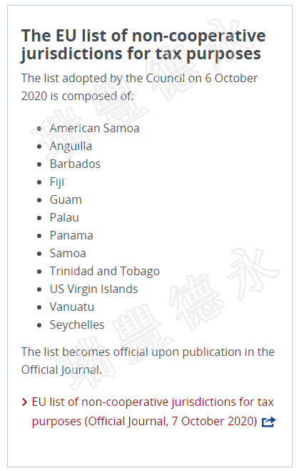 它列出了非歐盟司法管轄區,這些管轄區要么未與歐盟就稅收治理進行建設性對話,要么未履行其承諾實施改革以遵守一套有關稅收良好治理標準、稅收透明標準、稅收公平,及實施國際標準以防止稅基侵蝕和利潤轉移。