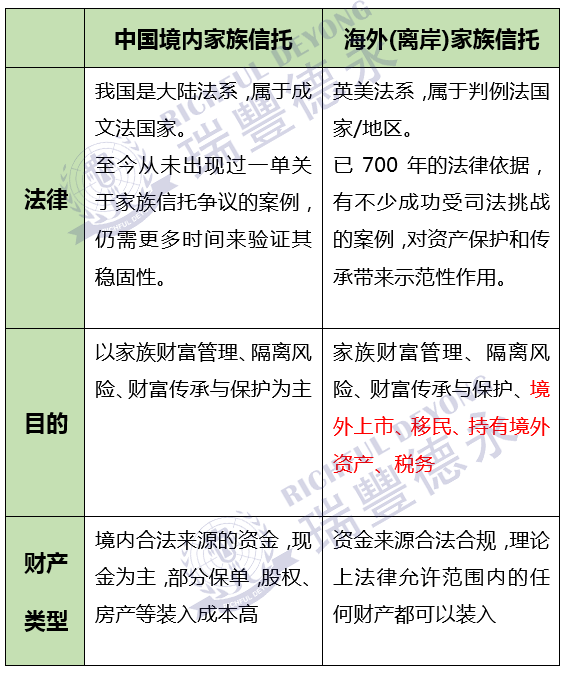此前瑞豐德永也為大家對比過中國內(nèi)地家族信托與境外家族信托的區(qū)別。境外家族信托其實除了在上述稅務(wù)籌劃方面占優(yōu)勢之外,更有法律層面、目的、裝入財產(chǎn)類型等方便優(yōu)勢,請看下表↓