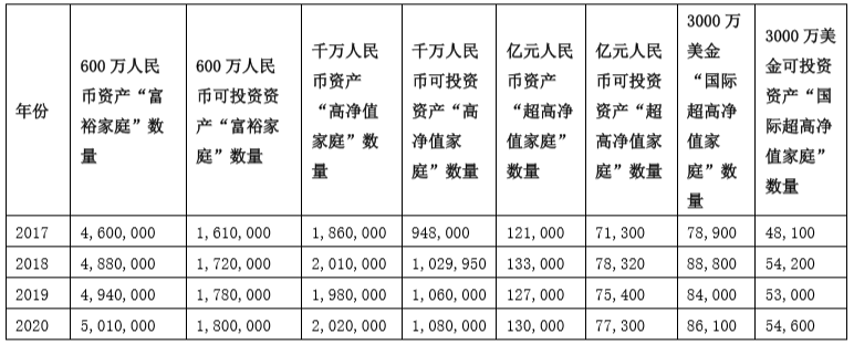 根據(jù)《2020胡潤財富報告》的數(shù)據(jù)顯示,2020年中國600萬資產(chǎn)“富裕家庭”數(shù)量首次突破500萬戶,比上年增加1.4%;千萬資產(chǎn)“高凈值家庭”比上年增加2%至202萬戶;億元資產(chǎn)“超高凈值家庭”比上年增加2.4%至13萬戶。